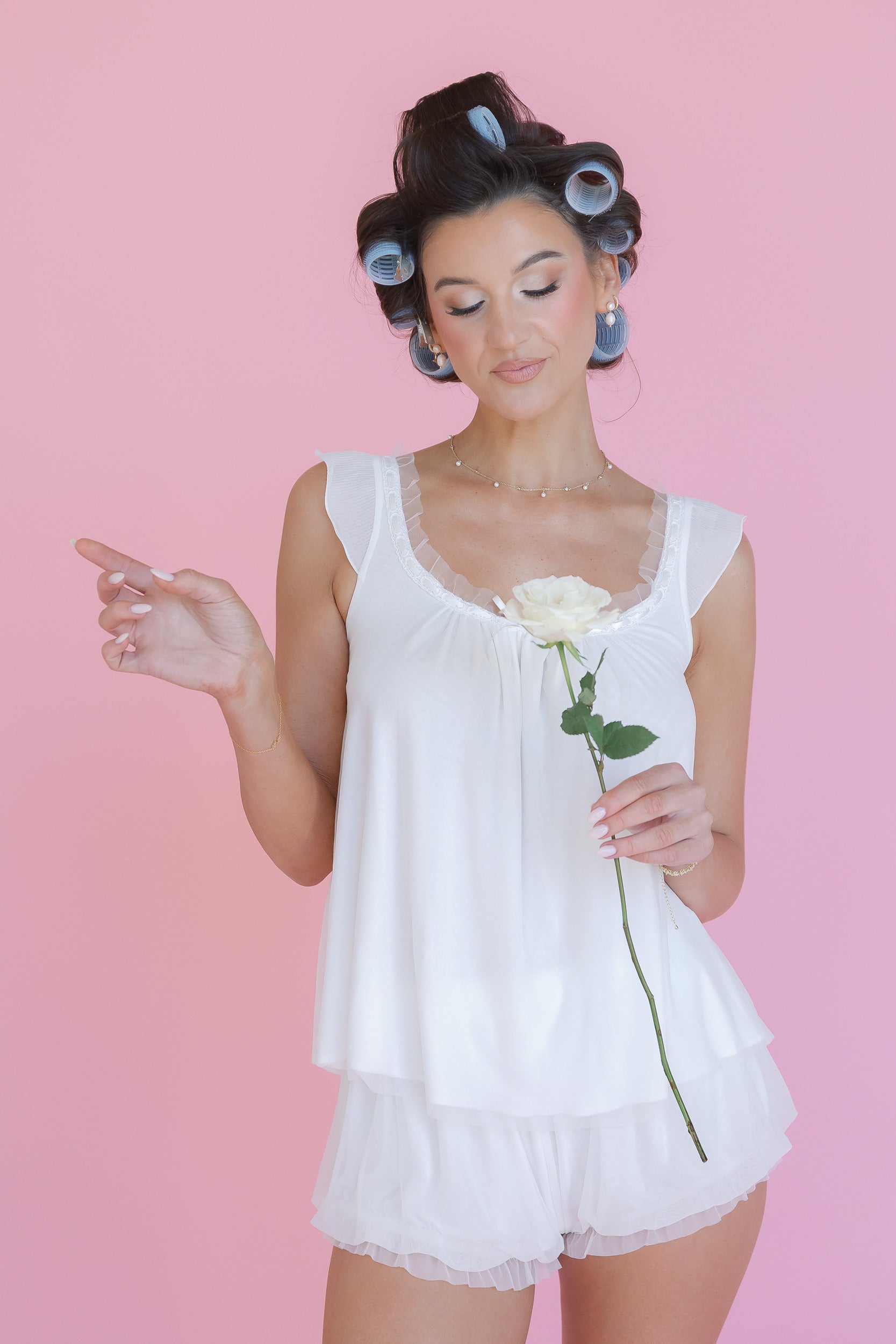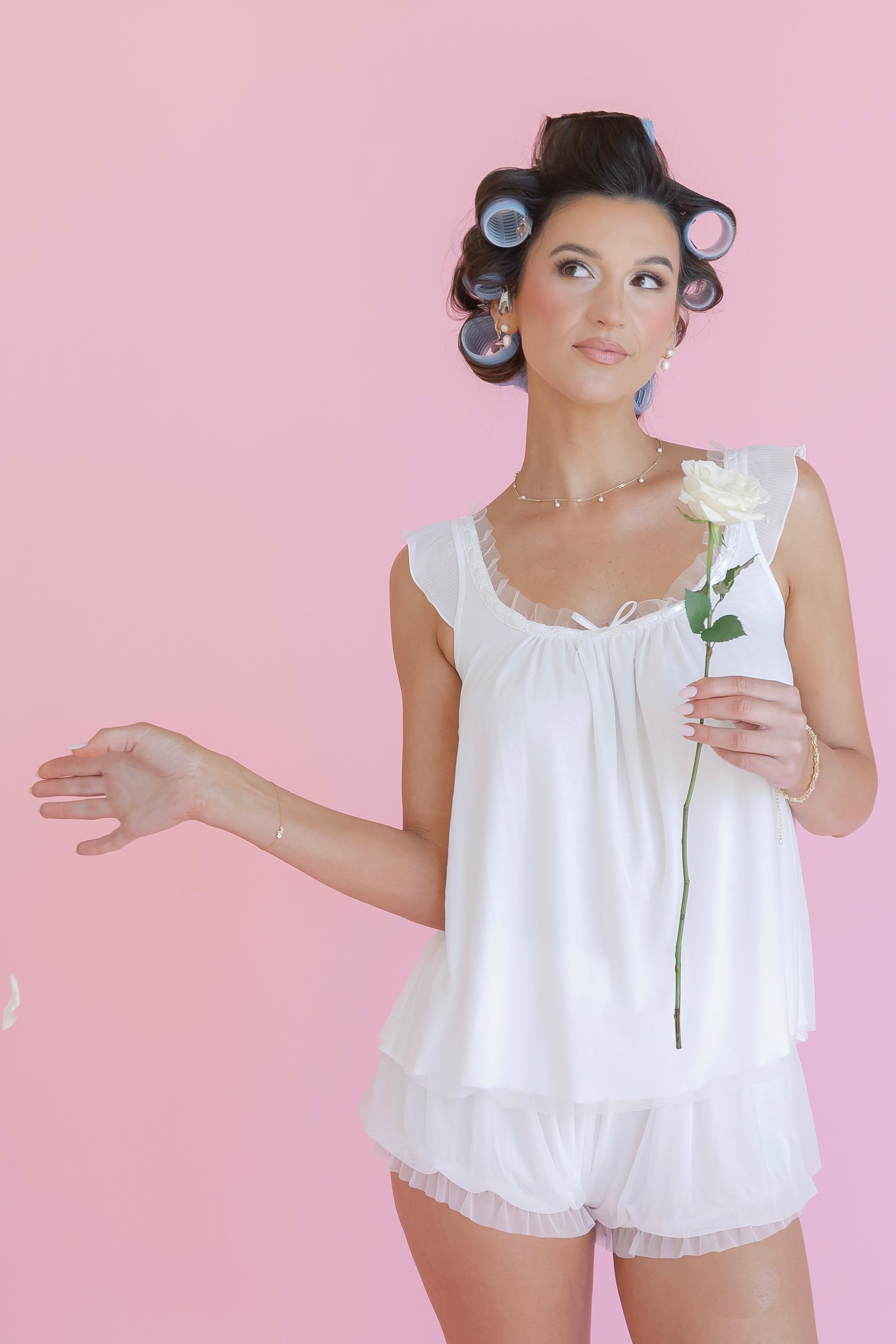 The Colette Set is effortless, romantic, and perfect for your wedding morning. Crafted from ultra-soft modal fabric, this airy two-piece set feels lightweight, breathable, and beautifully smooth against the skin. The set features a soft, flowy camisole paired with delicate ruffle-trim shorts for the perfect balance of comfort and femininity.