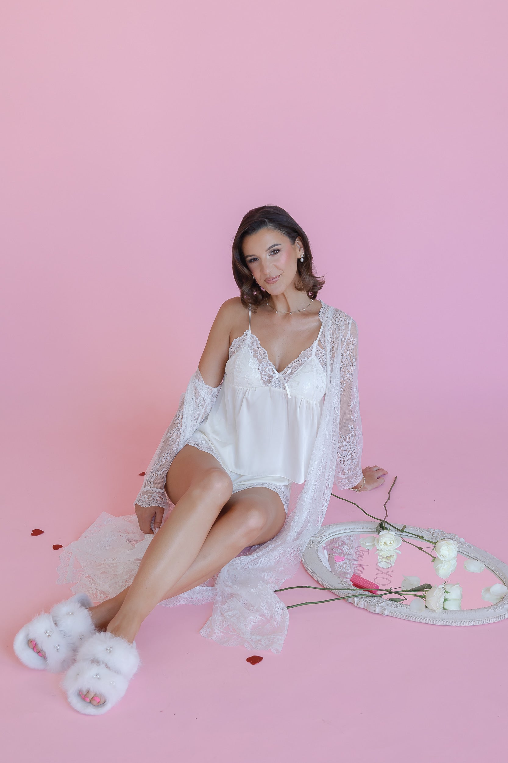 Set Includes: A soft satin camisole top with removable cups for customizable comfort & matching shorts—all trimmed with intricate lace for a feminine, romantic touch. - Material: Lightweight and breathable satin for ultimate comfort, keeping you cool and relaxed as you prepare for your big day.