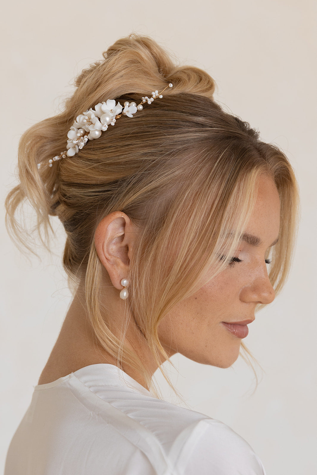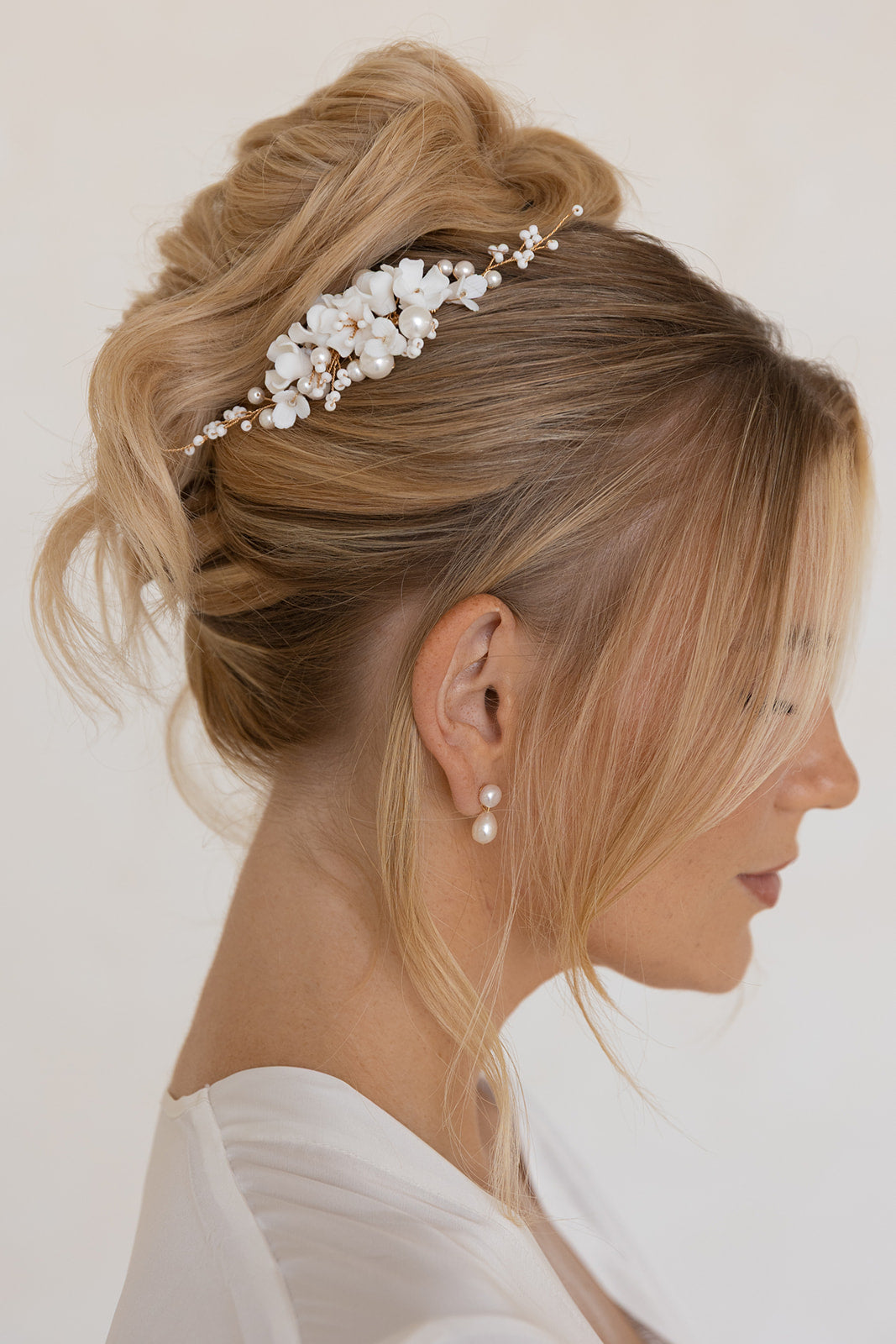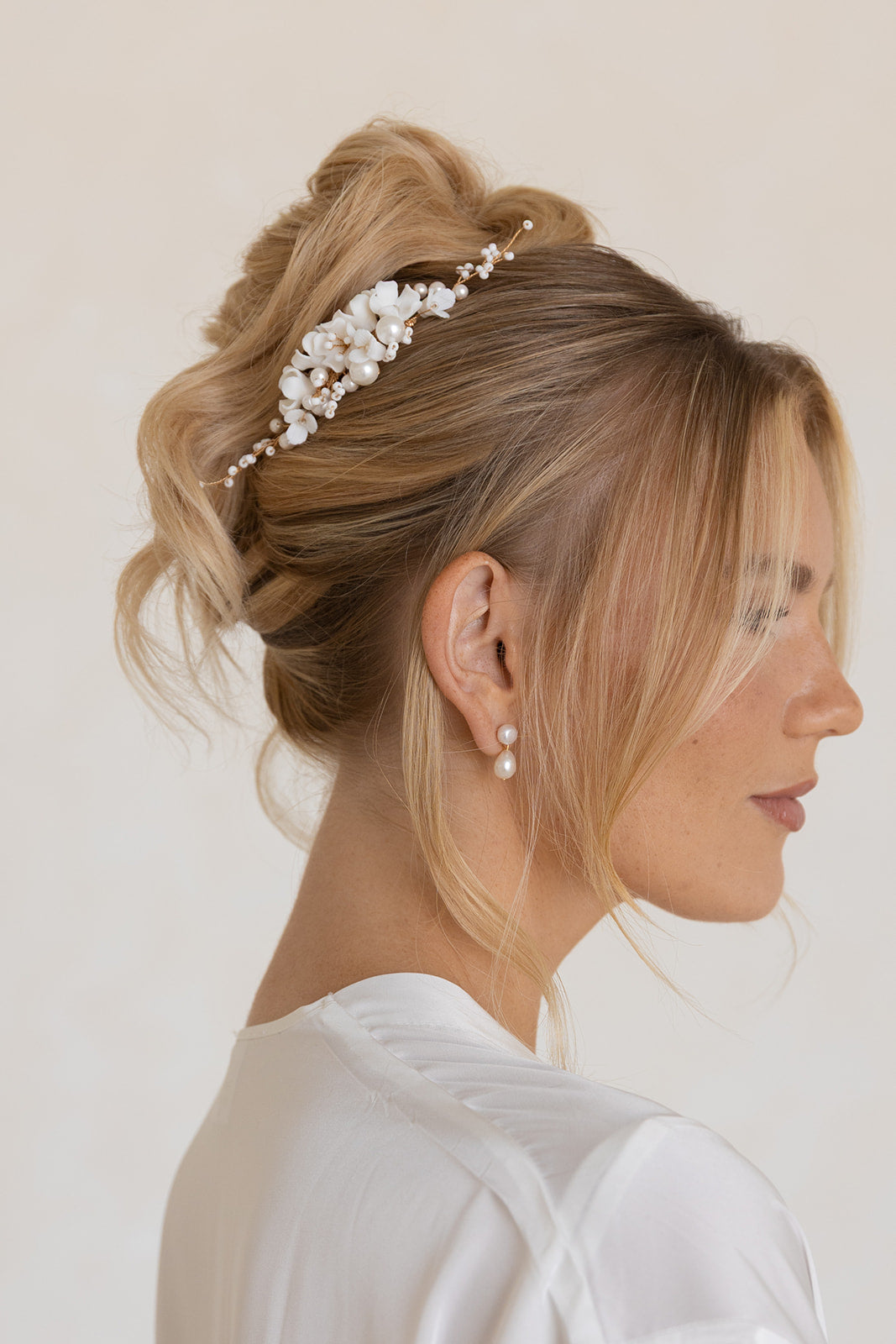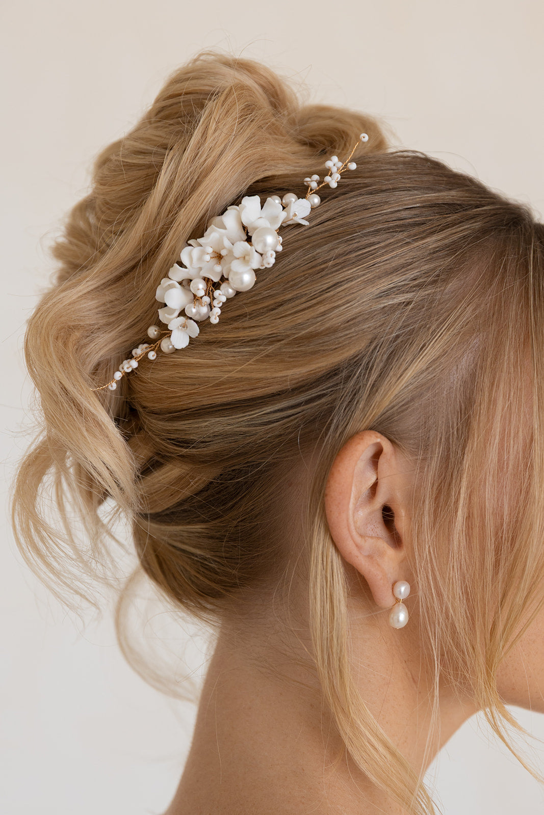 Elevate your bridal hairstyle with our exquisite Coronado Comb. Adorned with delicate ceramic flowers, faux pearls, and intricate beading, its whimsical design will add a touch of romance to any hairstyle. A statement piece that suits a variety of bridal looks, this comb is perfect for those seeking a touch of luxury on their special day.