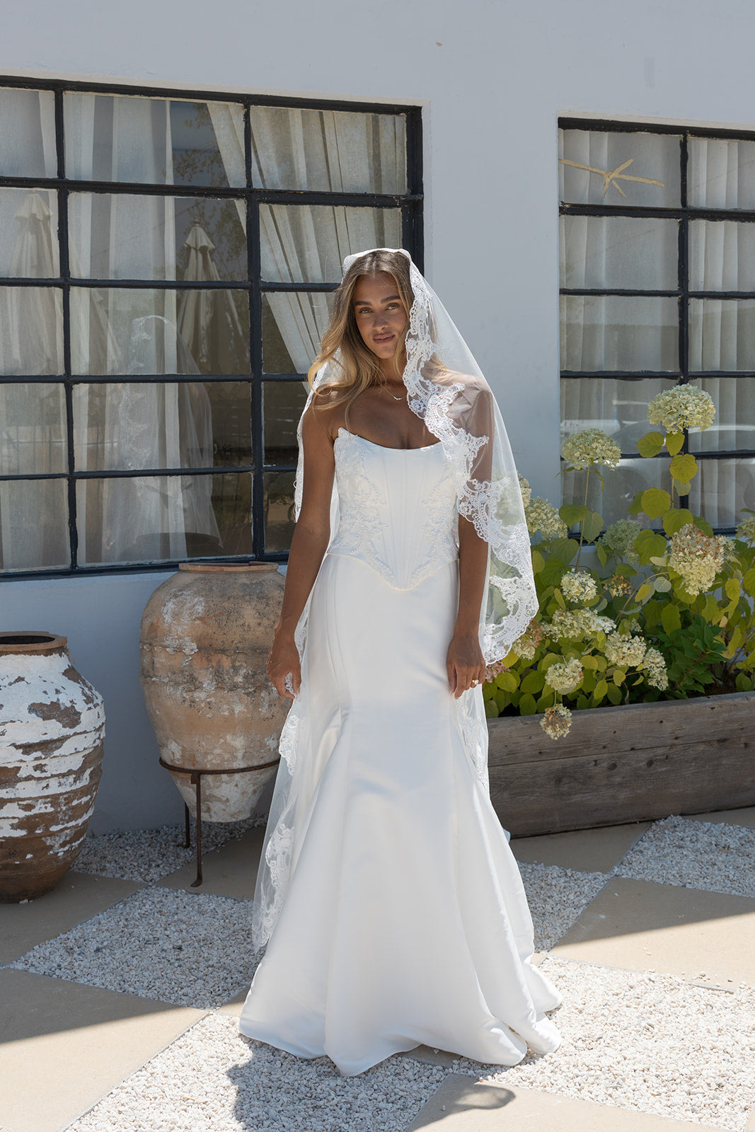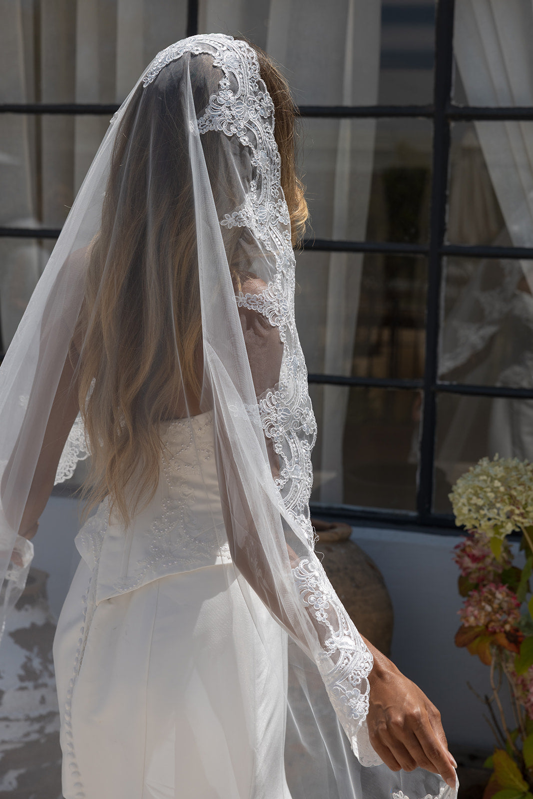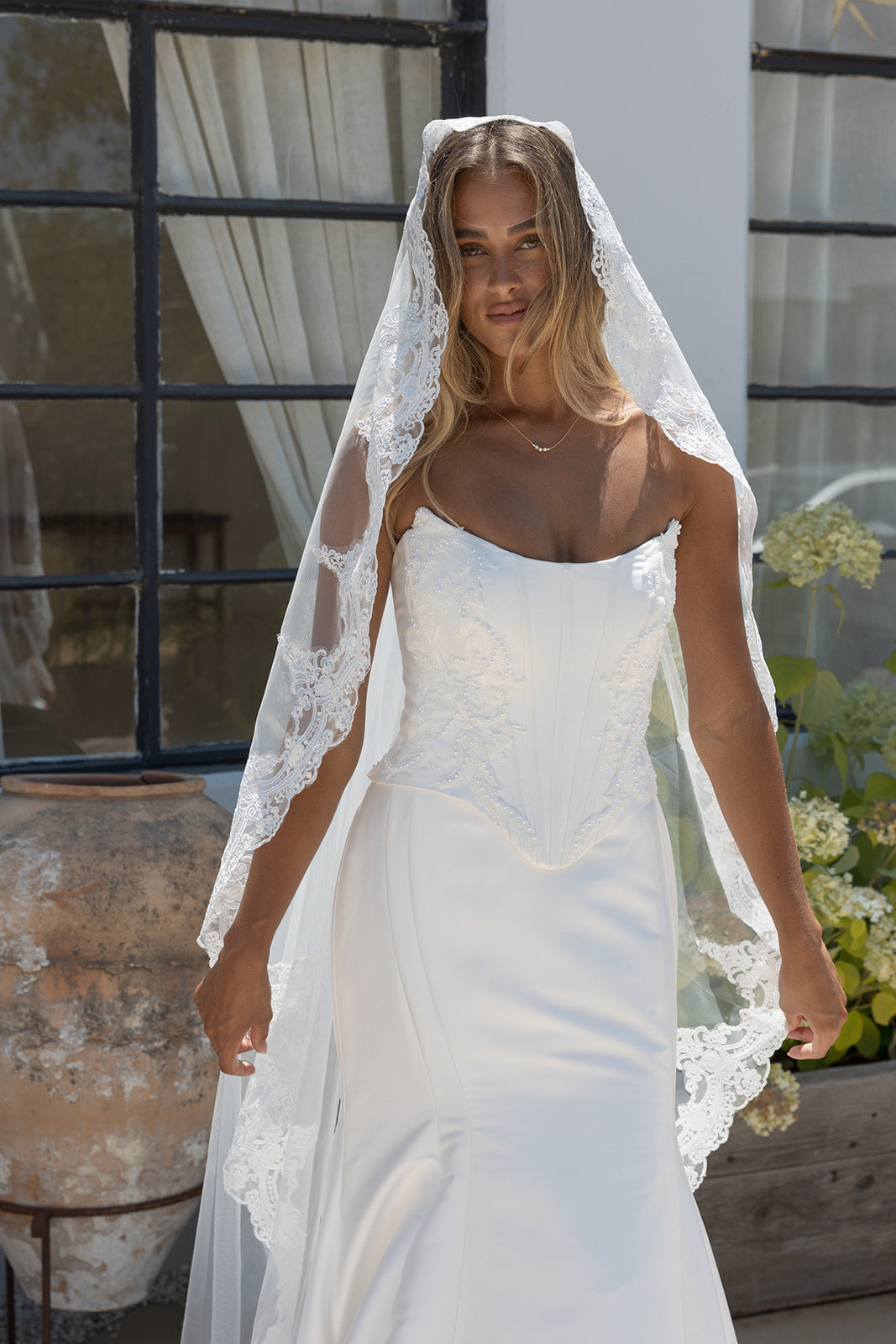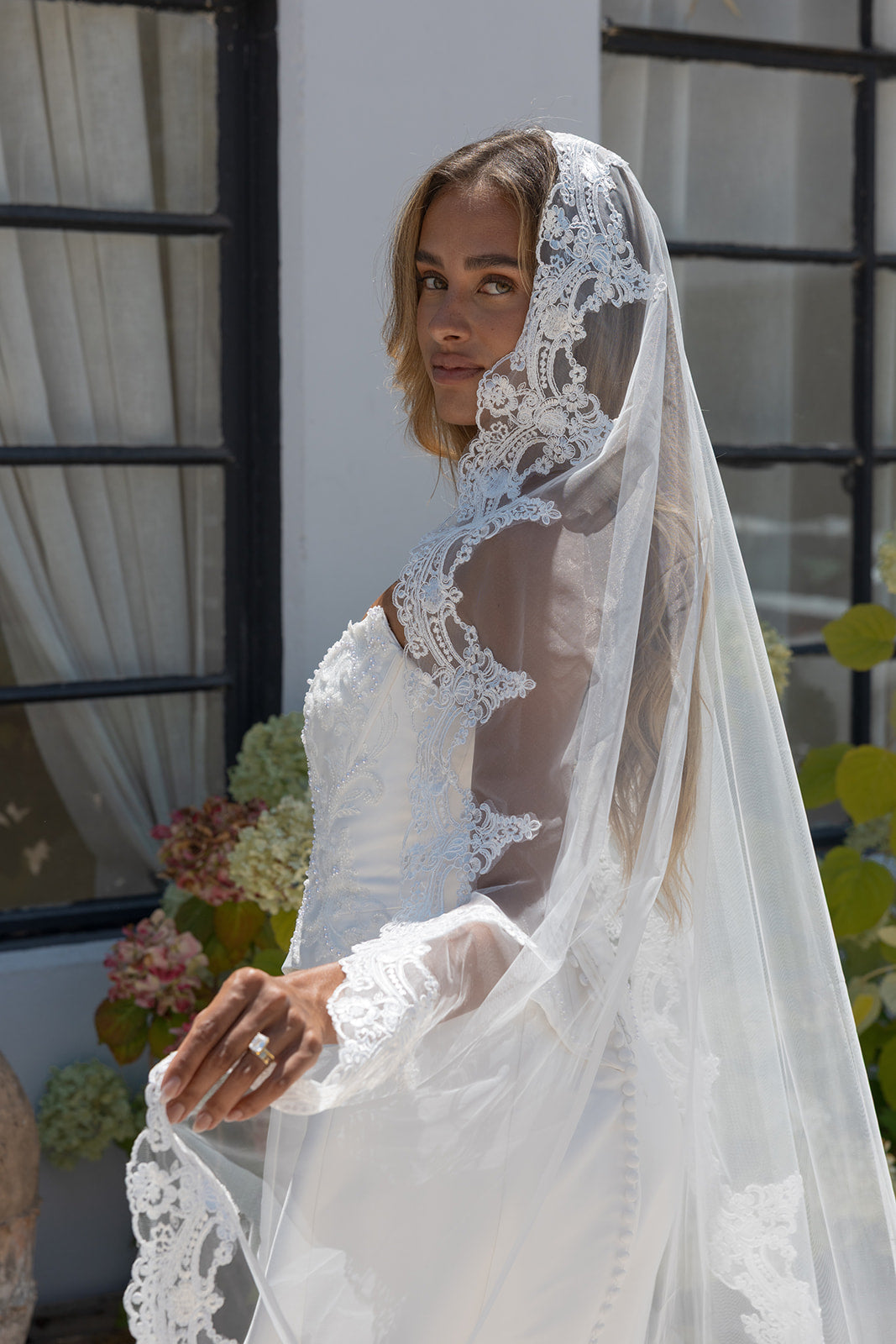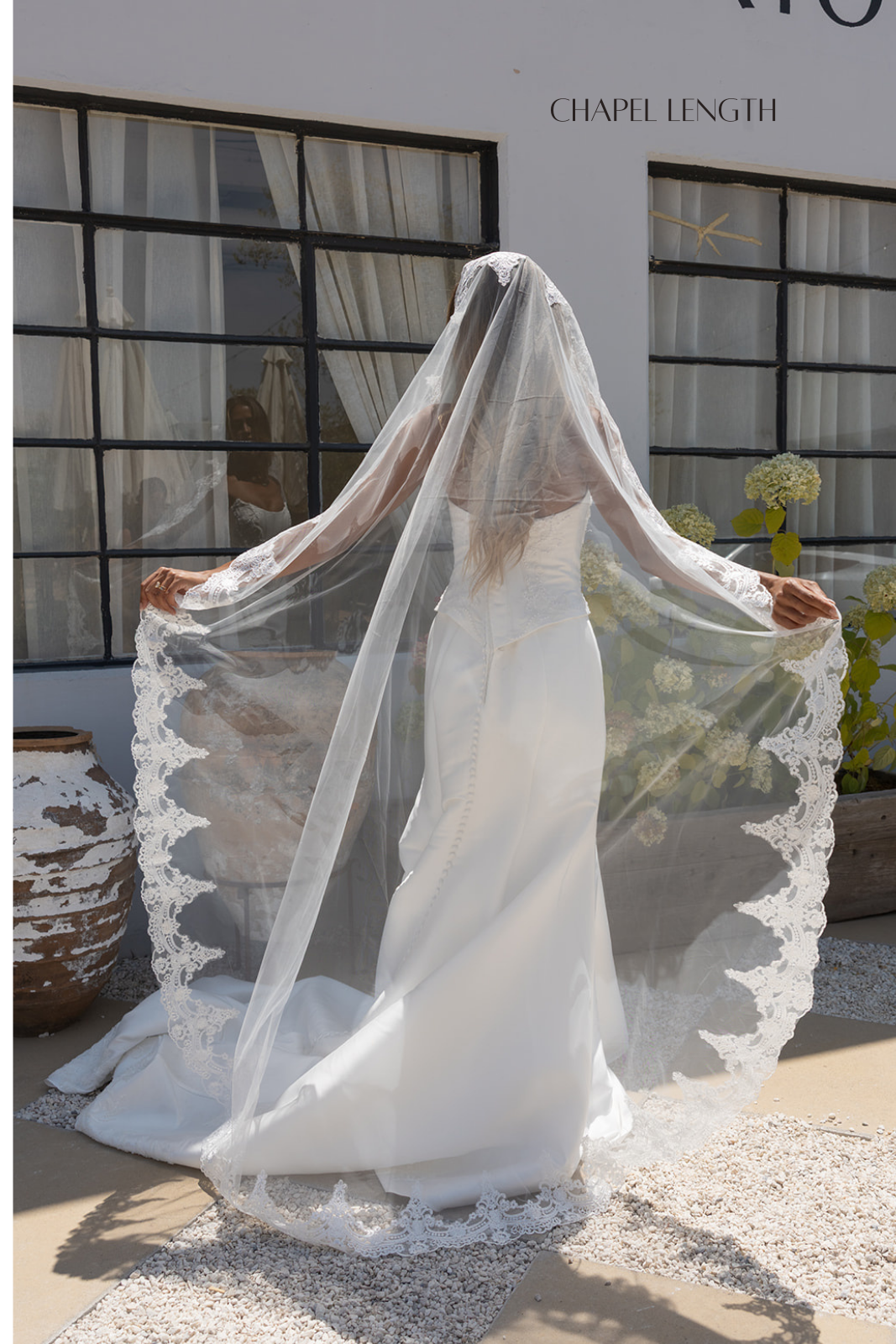 A romantic nod to timeless tradition, our Francesca Veil features a dramatic silhouette trimmed entirely in French lace. The lace has a slightly structured feel, allowing the edges to hold their shape beautifully for an elevated, regal finish.