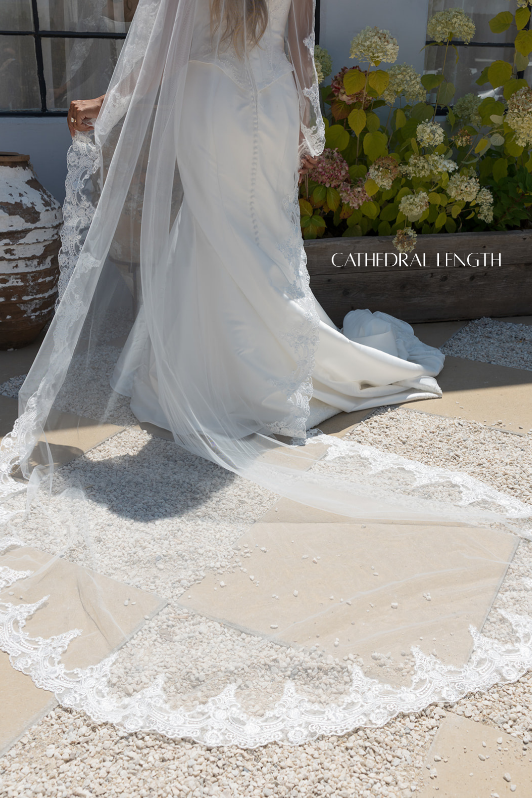 Crafted from ultra-soft tulle, this veil drapes effortlessly and can be styled near the hairline for a classic, cathedral-inspired look or worn lower for a more modern touch. An invisible metal comb is delicately hand-sewn beneath the lace to ensure a secure and seamless fit.