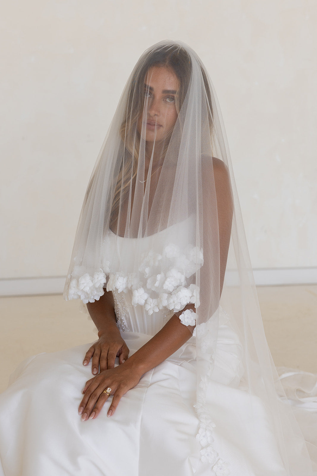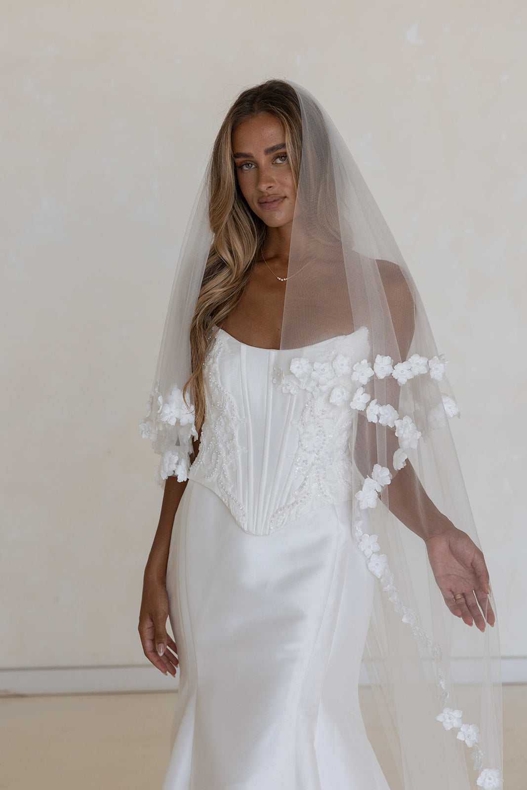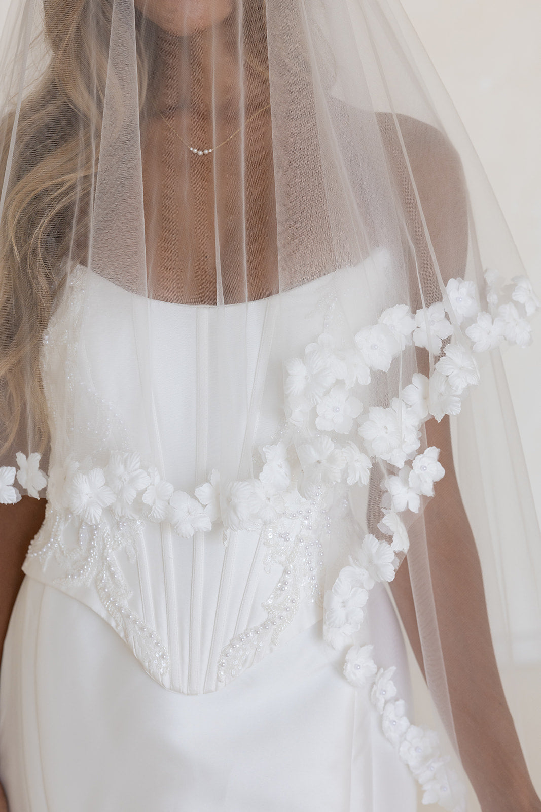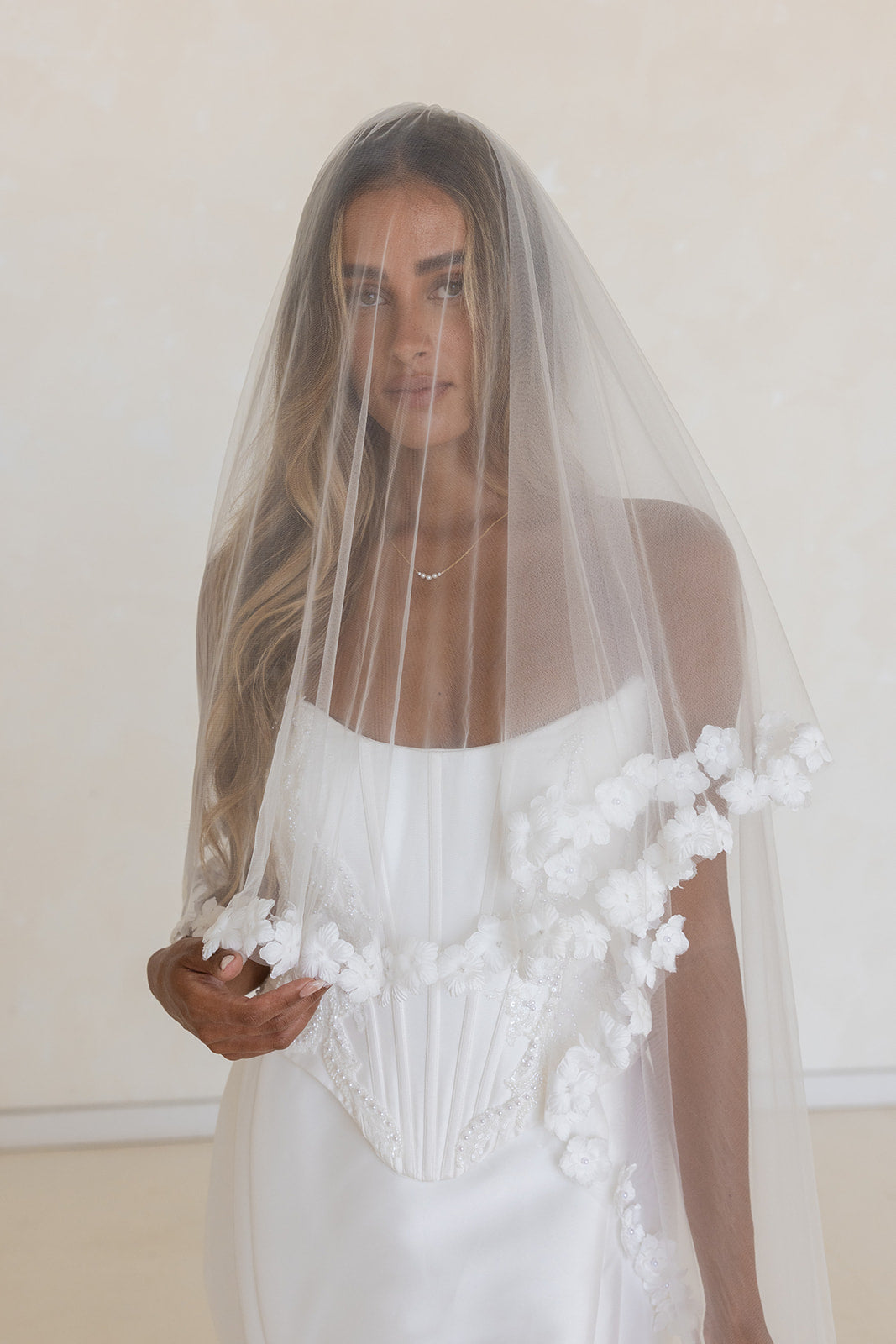 The Harlow Veil is a romantic two-tiered veil with a classic blusher, made from extra-soft tulle that drapes effortlessly. Its full circumference is edged with delicate three-dimensional florals, giving it a dreamy, garden-inspired feel. Lightweight yet dramatic, it’s the perfect finishing touch for a timeless bridal look.
