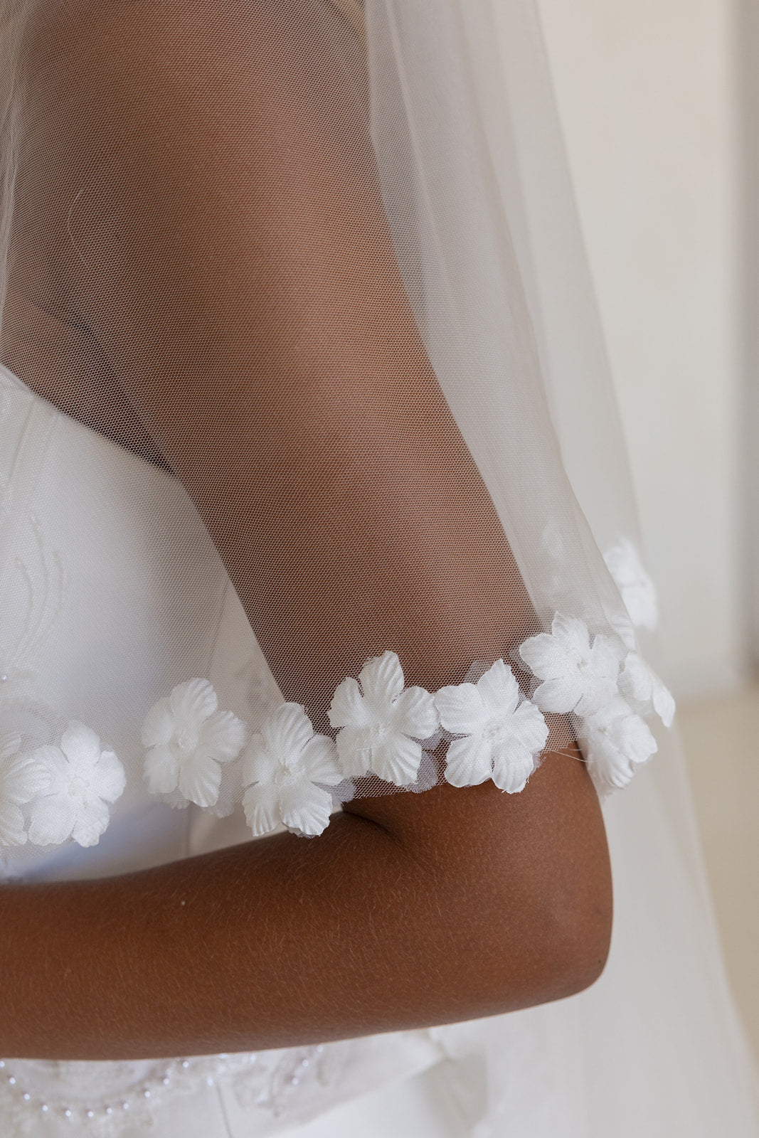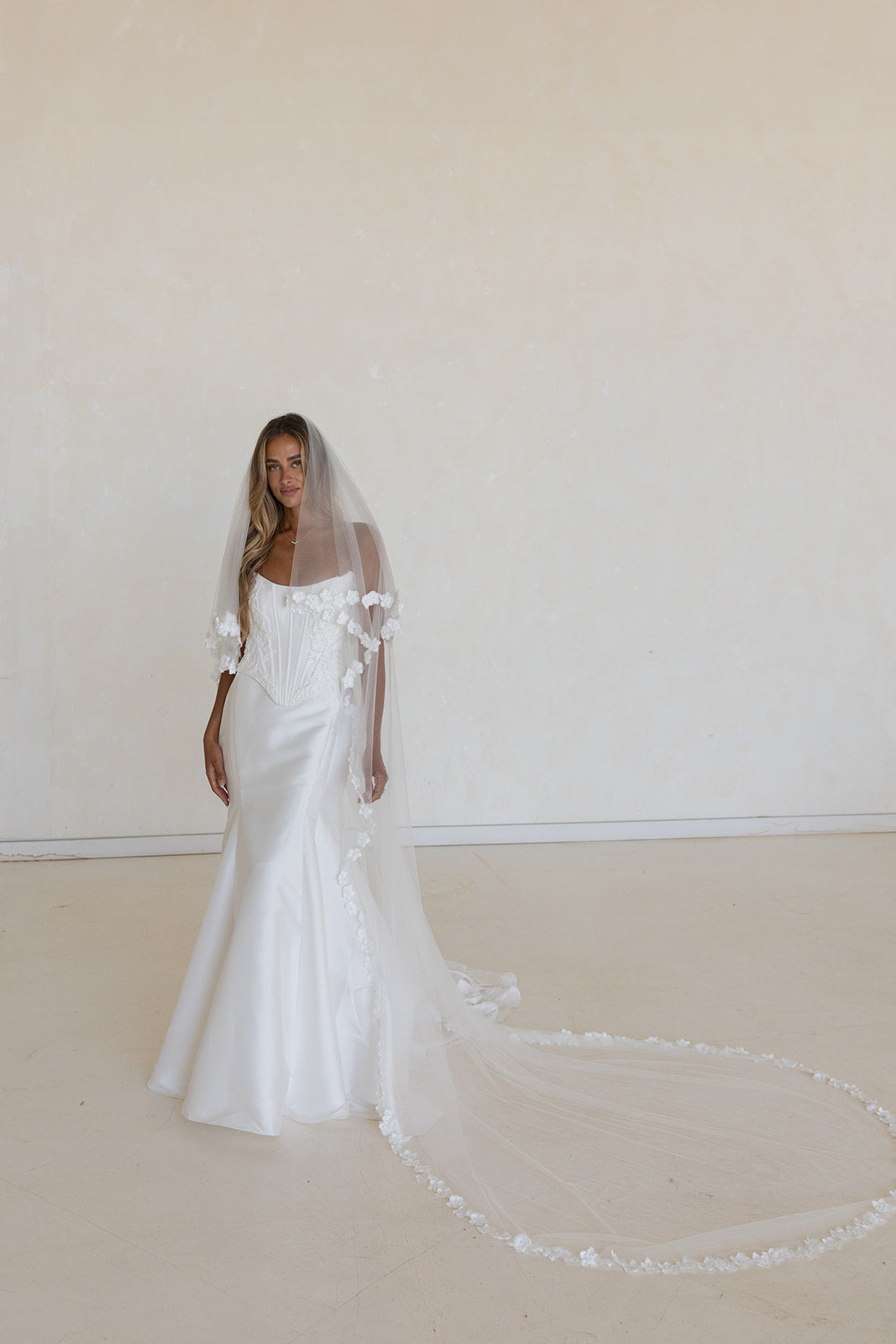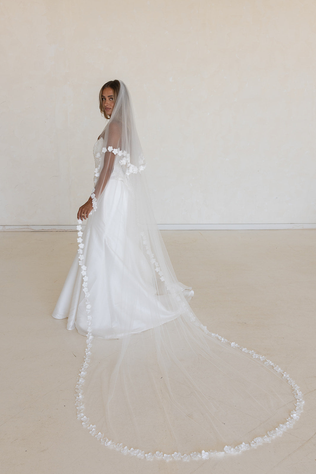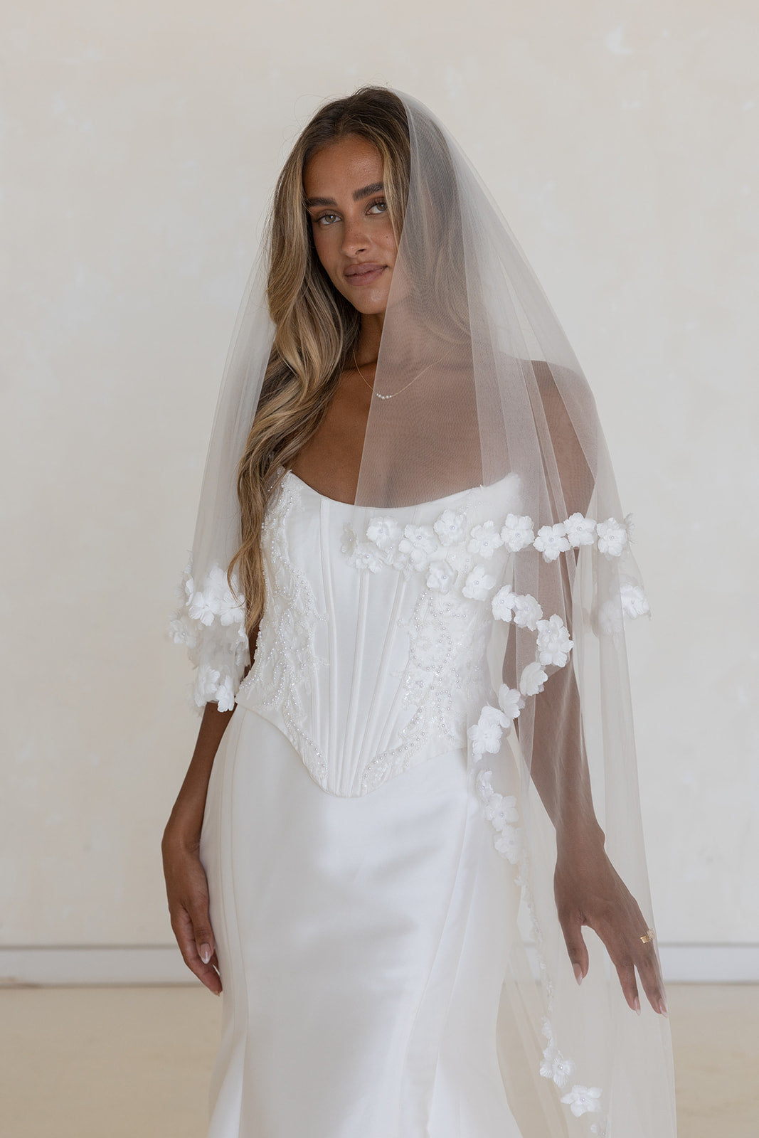 The Harlow Veil is a romantic two-tiered veil with a classic blusher, made from extra-soft tulle that drapes effortlessly. Its full circumference is edged with delicate three-dimensional florals, giving it a dreamy, garden-inspired feel. Lightweight yet dramatic, it’s the perfect finishing touch for a timeless bridal look.